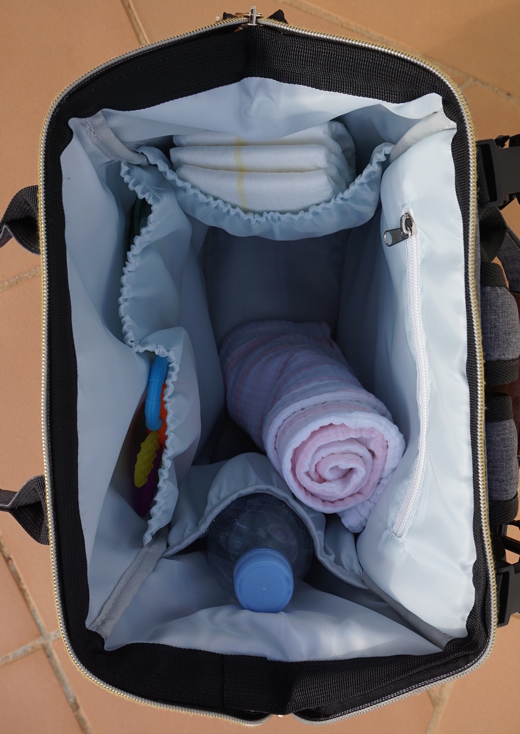 In addition to the handle straps, another beneficial feature of the Anchored East Diaper Backpack are the two extra straps that can buckle on to a stroller. I think this detail really sets it apart from a normal backpack, because you can free your back and body from the weight of whatever you’re lugging around for the day.