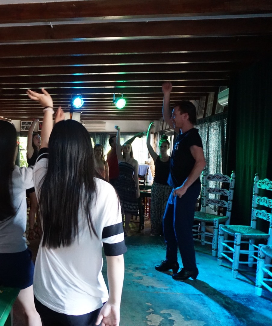 Whenever our travel itinerary includes Granada, I always get to take my GW group to Jardines de Zoraya for a special night out. Jardines de Zoraya is an excellent restaurant and “tablao” tucked into the Albayzín neighborhood. We choose this venue for our Global Works groups because we have the opportunity to take a private flamenco dance lesson before dinner and the show. The lesson is always good fun, and it’s the perfect primer for the rest of our evening.