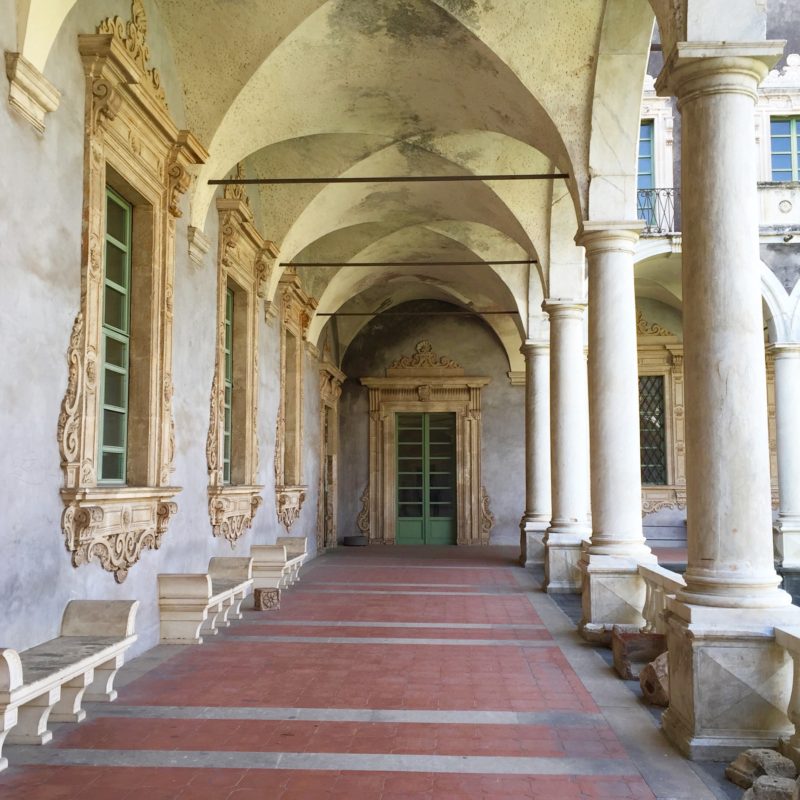 On a blue-sky day, I walked up the streets of Catania with Alessandro Costa, the founder of Clear Sicily. We approached an ancient cathedral that looked like it had been chopped in half, and then passed through the gated wall of a large, Baroque building. We had stepped onto the grounds of the impressive Benedictine Monastery of San Nicolò (Monastero dei Benedettini di San Nicolò l’Arena). Upon our arrival, we met Francesco Mannino and Nicola Caruso of Officine Culurali, an organization that gives tours and coordinates social and educational programs at the monastery. After some business talk, Nicola graciously offered to show Alessandro and me around this fascinating Sicilian landmark.
