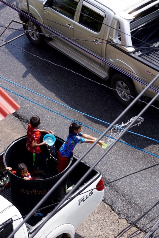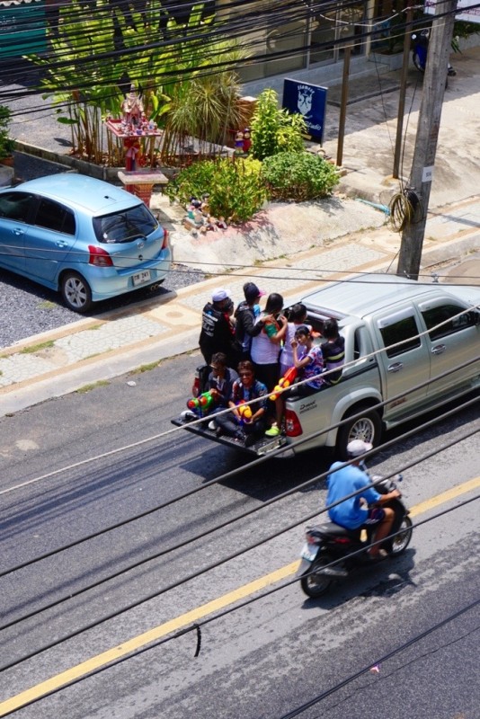 All across Thailand, locals and travelers are getting soaked this week, because people don’t just carry water guns around town. Oh no… they bring out large bowls, buckets and hoses for these streetside skirmishes. And from what I saw on Phuket Island’s southern end, friends and family gather around massive water tanks and overflowing barrels that are stationed along the street to make for easy, accessible, and never-ending ammo. Also, water barrels and piles of people are carted around in truck beds for mobilized Songkran parties.